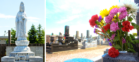 墓地の本尊である観音さまの目線から見える景色は、私のお気に入りの景色のひとつです。お墓はすべて羊蹄山に向かって建てられ、本堂と羊蹄山をいつも見ながら休むことができる場所が真言院の墓地です。札幌をはじめとした都会の檀信徒の皆様は、お盆に渋滞を抜けて自然いっぱいの墓地へお参りするのが癒しだと言ってくださいます。また、建物内には年中お参りが可能な納骨堂もございます。お気軽にご相談ください。